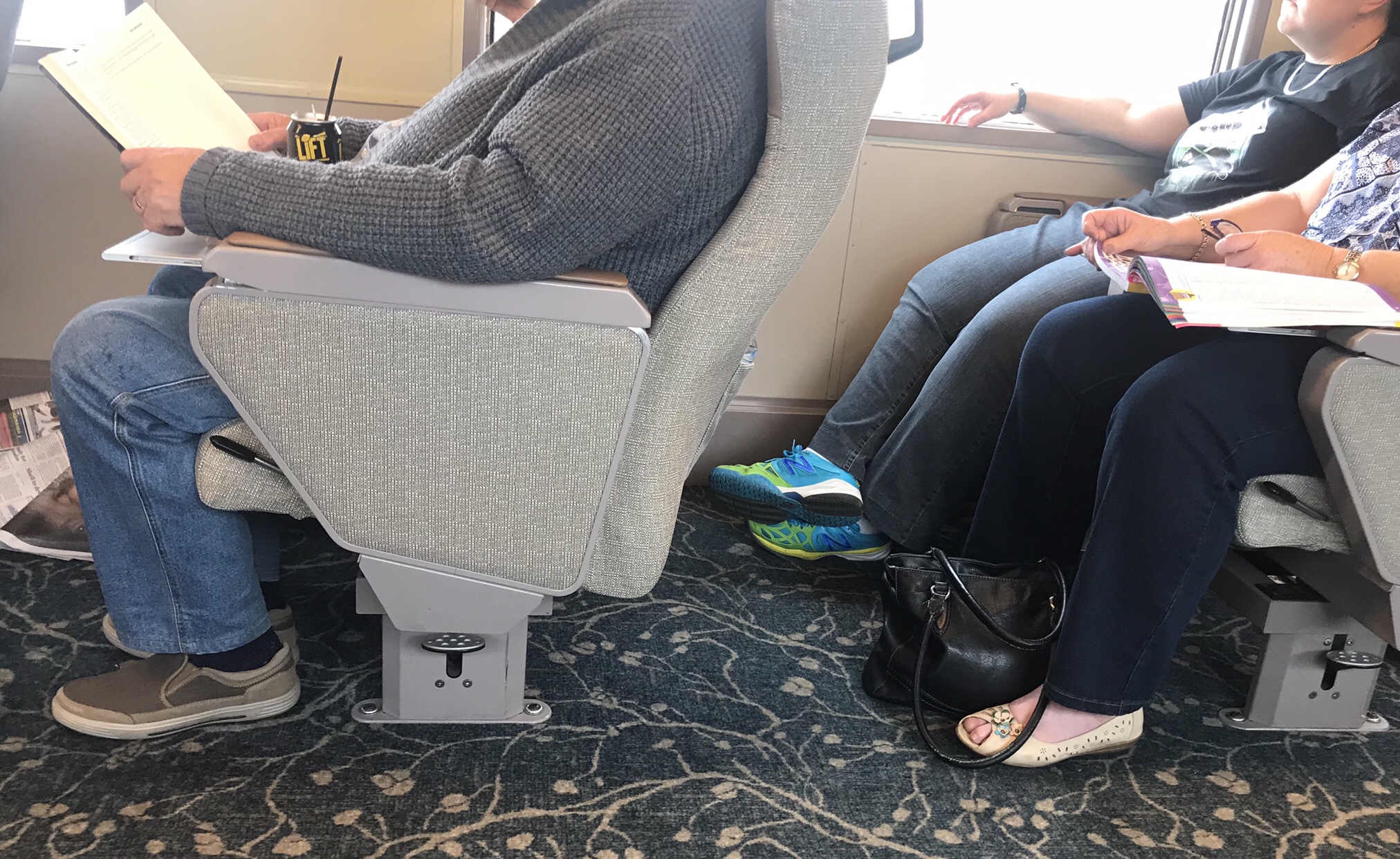 Interior of the Overland Train . No access for electronic devices, no wifi, no footrests for shorter people.