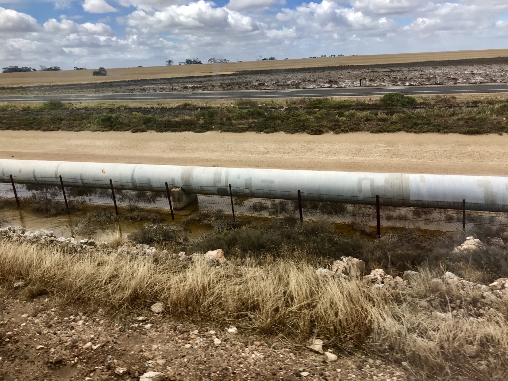 The train speeds up and we continue on our way. Along side the track appears this massive water pipe which runs for kilometres.