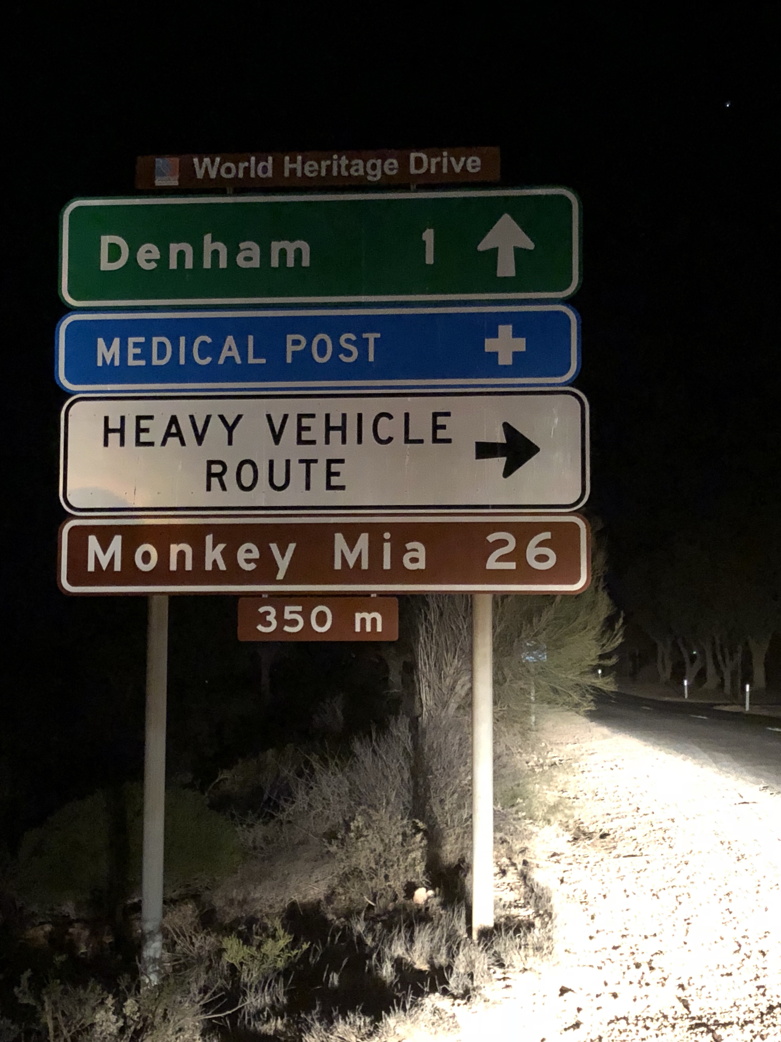 26 km to Monkey Mia. It’s late and we’ve had no tea, but the three of us are in good spirits. Cold hard bitch by Jet plays from our playlist. We’ve listened to music from Beethoven to Pavarotti to John Denver to Ed Sheehan to Jet. A diverse group of musicians mixed in amongst over 600 songs. Western Australian outback roads are straight and flat and long! They cover 100’s of km.