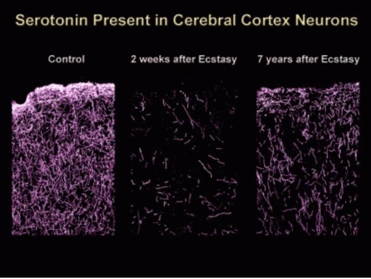 I feel people have a false sense of security with the notion of, stacks of people take it and nothing happens to them. If particular drugs are not causing immediate heart failure or neurological devastation through stroke or other nerve destruction or malfunction it may be causing hidden deficits that may be accumulative or causing insidious acquired brain injuries. An example of this can be seen in the above image. After 7 years of MDMA use the serotonin containing nerve endings have not recovered and are shown in fewer numbers.