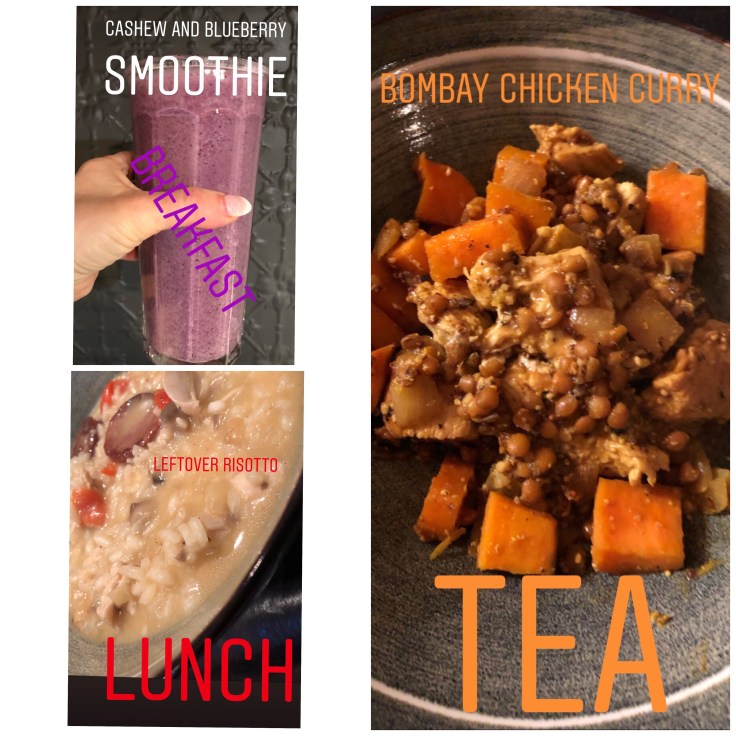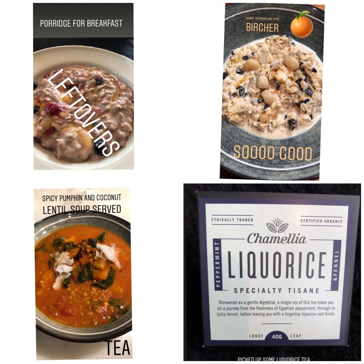 I’d forgotten to pre prepare my orange macadamia thyme Bircher so made it this morning ( I planned to follow Monday’s menu). There was a porridge serving left over in the fridge so I decided to warm that and have that for breakfast. Something had happened to my online order and I didn’t receive an eggplant. It was cold and rainy in Melbourne so I just had the Bircher I had made earlier for lunch. Not ideal two oats breakfasts in one day but perhaps better than toast and vegemite which I contemplated.