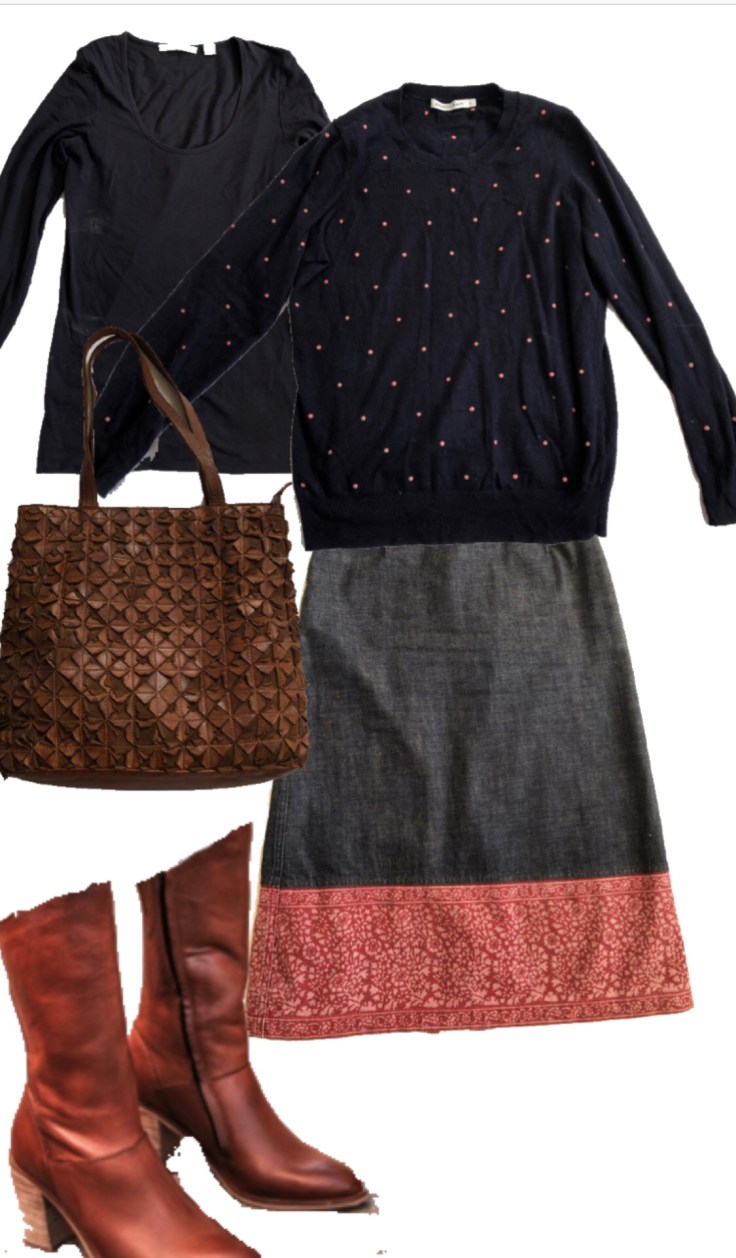 Country Road long sleeve blue top and skirt, Sportscraft Cotton Jumper, Jo Mercer mid calf tan boot and Kompanero Danielle tan leather bag.