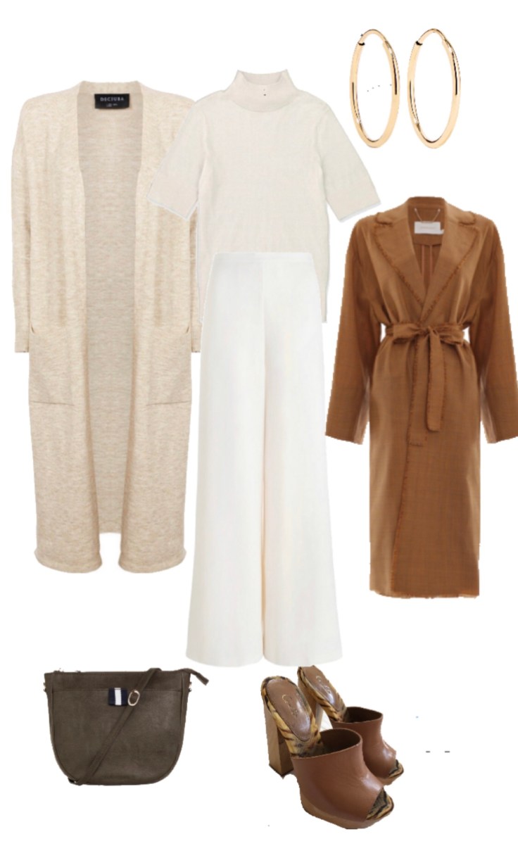 Zimmermann cream wide leg pant and coat, country road cream knit top, decjuba long line cardigan , Camilla shoes, Sportsgirl gold coloured loop earrings, Elms and King New York olive shoulder bag .