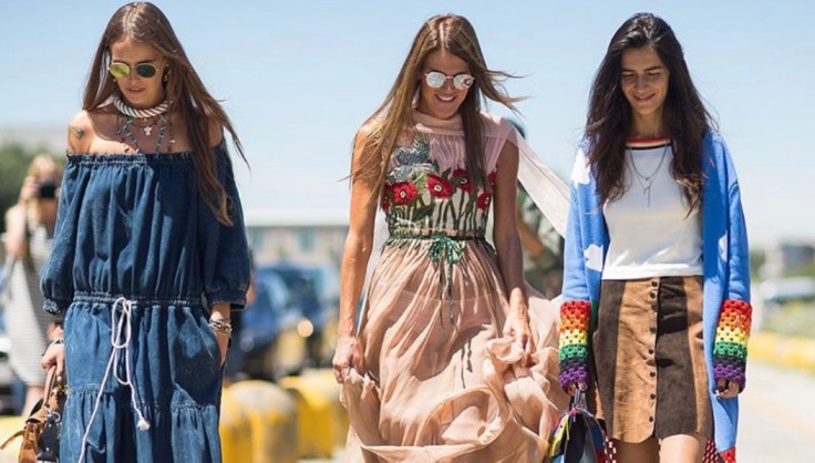 Bohemian based on free flowing and flower fabrics. Long flowering tiered skirts and dresses, peasant blouses, and ethnic touches like tunics or wood jewellery, is embroidery or embellishments with beading and fringed handbags and flat shoes.