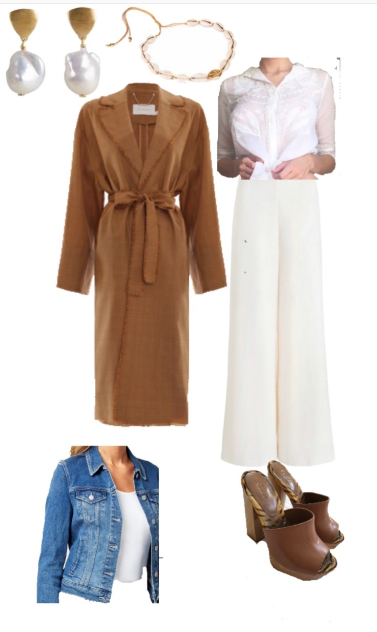 Zimmermann cream high waisted wide leg pant and coat, Louise Marie De Montery Camille Blouse in Ivory available from Splice Boutique, Mavi Jean Jacket, Fairly earring, Tohum Necklace available from For Artists Only and Camilla.com shoes.