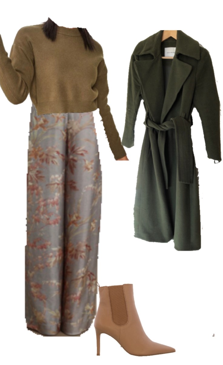 Zimmermann high waisted pant, cotton on olive woollen jumper, Camilla and Marc Olive woollen cost, and Tony Bianco boots