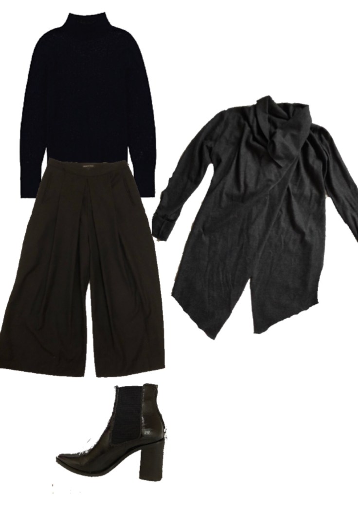 Country Road black wooden jumper and culotte pants, Saba woollen jacket and Jo Mercer black patent leather boots