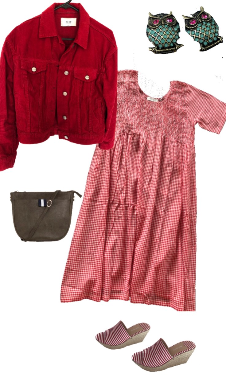 Neuw cord jacket, Zafino owl earrings, Arabella night dress worn as day dress from Acorn Nursey Surrey Hills , Tony Bianco Wedges, Elms and King over shoulder bag.