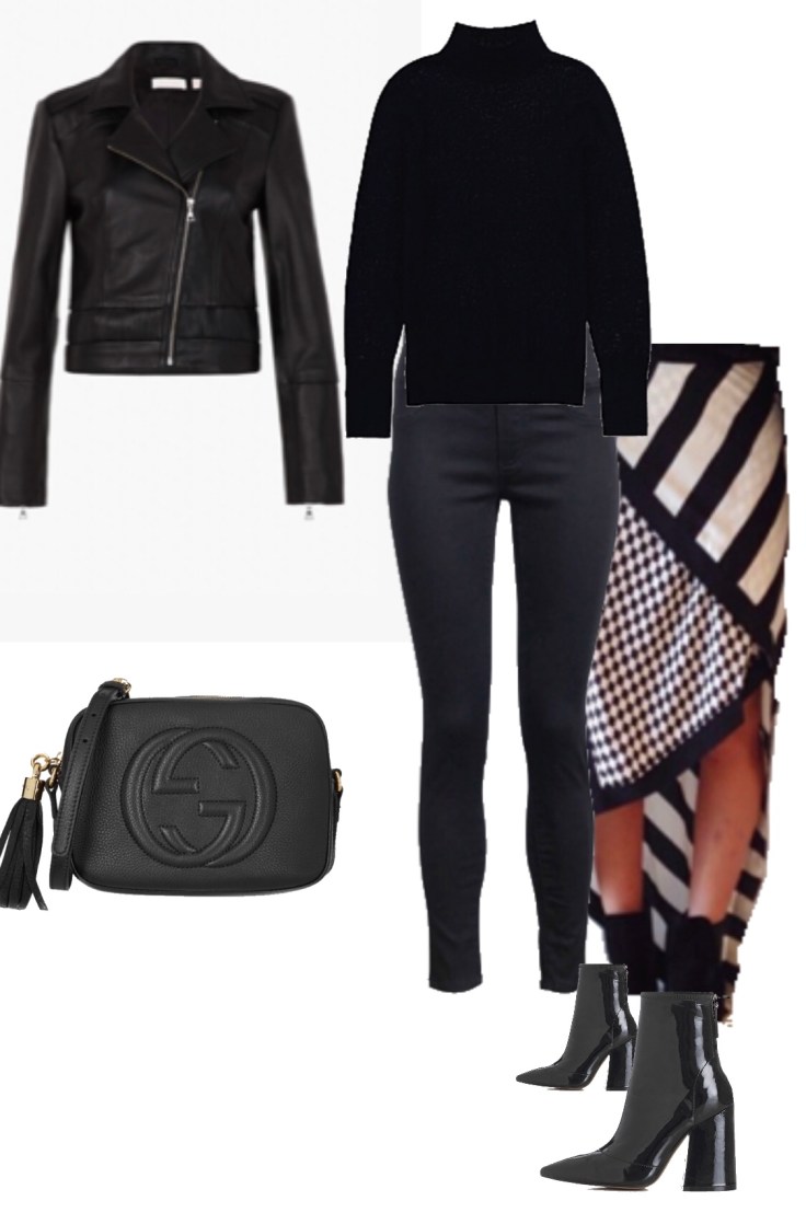 Sass and Bide black leather jacket and silk wrap skirt, Country Road light black knit jumper, Decjuba pants, Alias Mae patent boot and Gucci over shoulder disco bag.