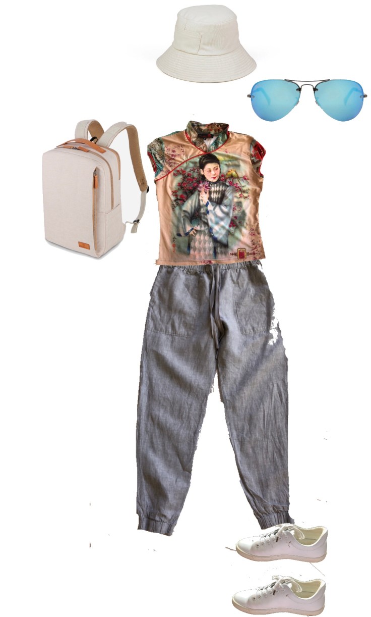 Nordiac backpack, Lack of Color bucket hat, Ray Ban blue mirror sunglasses, Seven Sisters Printed Tee, Witchery Linen relaxed pant and white casual shoe.