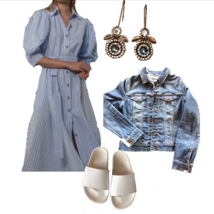 Evi Grintela shirt dress, Korso earrings, Mavi Jean jacket and Seed Heritage sliders